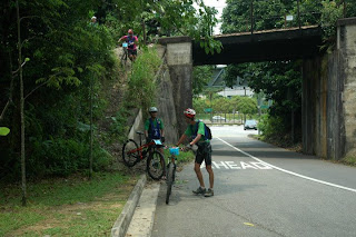 After picking up our bikes (phew!!!!), we were ready to rock and roll! We were in our element. After some bike portaging through a "lonkang" under the highway bridge, we rode onto part of the abandoned railway track.